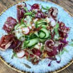 - Prepare the plates. Place the cucumber with the radishes on top in the centre of the plate. Roll the thinly sliced tuna and put it around it. Drizzle generously with the dressing and top it all off with some micro salad. Enjoy your meal!