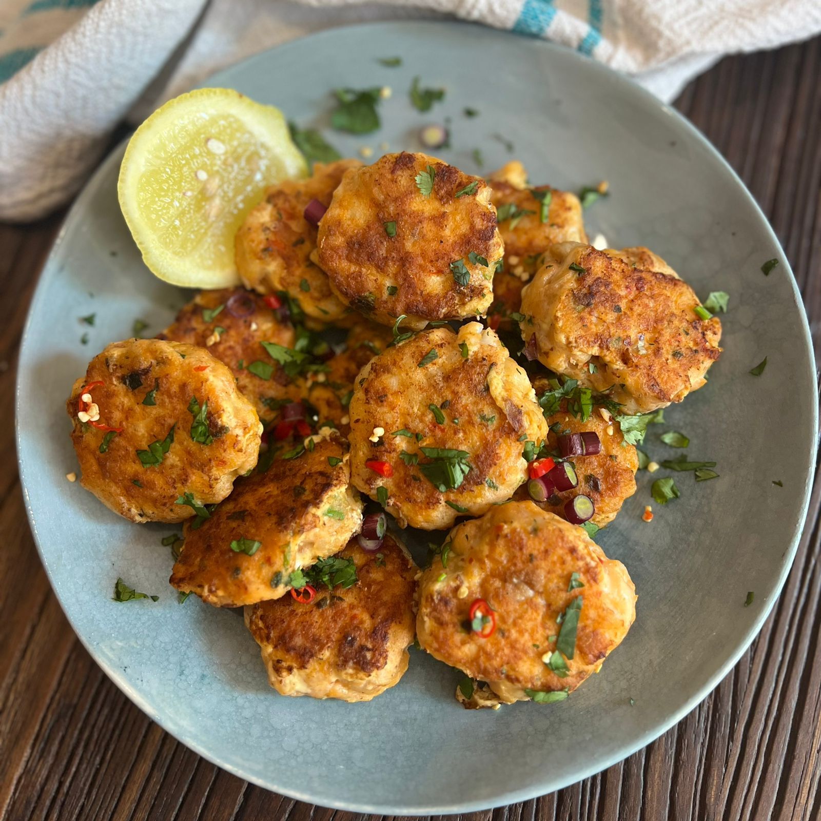 Ingredients: Fresh white fish, whole egg, Thai red curry paste, Thai Sambal Oelek, fresh spring onion, fresh coriander, lime zest (or lemon if limes are unavailable)