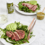 - In a medium bowl, toss the wild rocket and zucchini with 3-4 tablespoons of dressing. Place a large handful of salad onto a plate and top with sliced tuna and avocado. Drizzle with a little more dressing and serve with a crisp white wine.